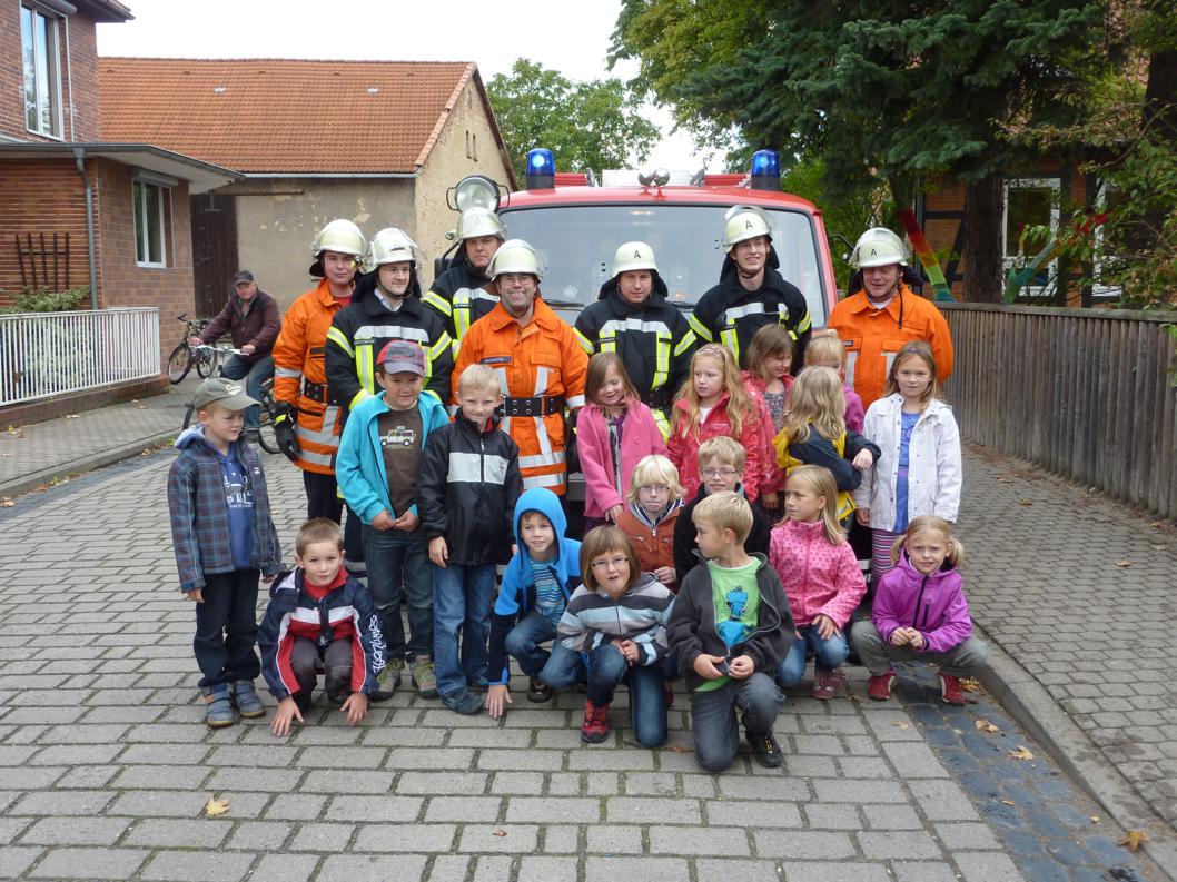 Am Dienstag, den 25. September konnte man um etwa 10.15 Uhr unsere Sirenen in ganz Schmedenstedt hören. Kurze Zeit später rückte unsere Feuerwehr in Richtung Grundschule aus. Zum Glück entpuppte sich der Einsatz nur als Übung. Beim Eintreffen an der Schule wurden wir von den Schulkindern, die sich bereits vorbildlich klassenweise auf dem Schulhof versammelt hatten, schon erwartet. Der unter Atemschutz in die 1. Etage des Schulgebäudes vorgehende Angriffstrupp machte - unterstützt von ein wenig Kreativität - Bastelarbeiten als Ursache für den "Brand" aus und konnte das "Feuer" sofort ablöschen. Ein weiterer Trupp schirmte das Gebäude von außen ab und sorgte für neugierige Blicke der Schulkinder. Genau passend zur nächsten Pausenklingel war die Übung beendet. Nach Gruppenfotos mit den Schulanfängern konnten diese noch einen Blick in das Feuerwehrauto werfen und ihre