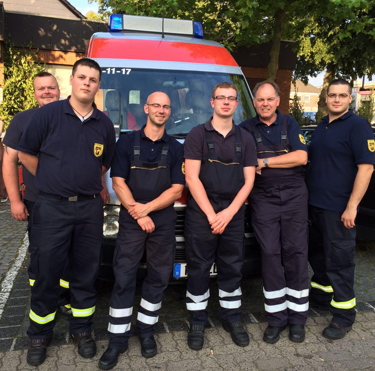 Auf dem Foto zu sehen sind (v.l.) Mirko Braatz, Maurice Lüddecke, David Ehrlich, Jannis Effenberger, Ortsbrandmeister Wolfgang Wiese und Marcel Miertzsch vor dem bereitgestellten Feuerwehr-Einsatzleitwagen.
