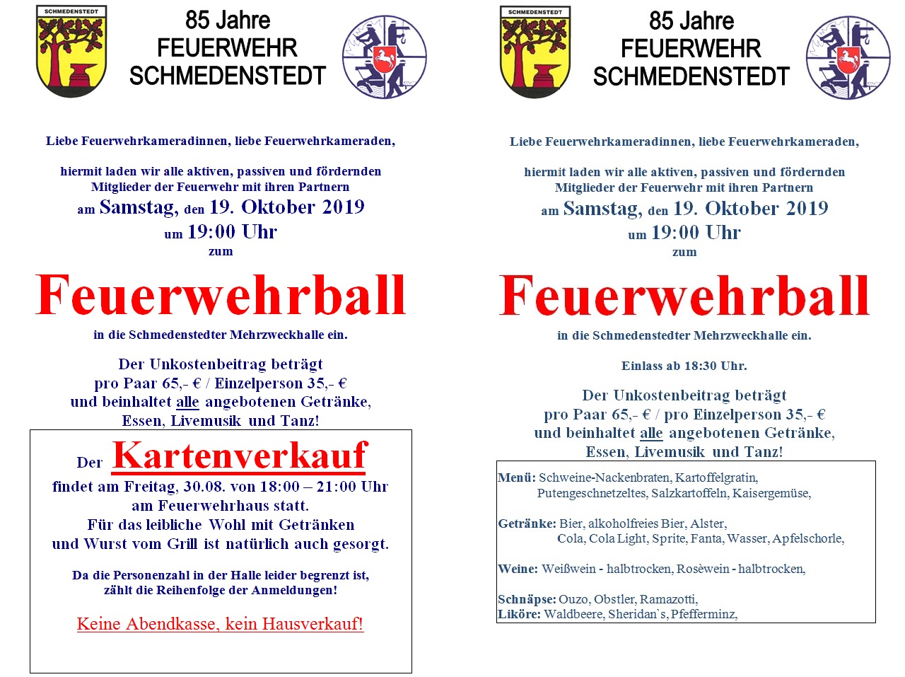 In diesem Jahr veranstaltet die Freiwillige Feuerwehr Schmedenstedt wieder einen Feuerwehrball für alle aktiven, passiven und fördernden Feuerwehrkameradinnen und Feuerwehrkameraden. Einzelheiten können den Flyern entnommen werden.